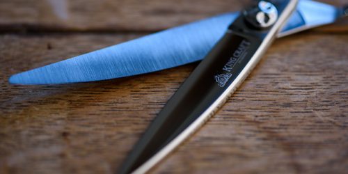 - 大きめの鋏ですが全体的に細めで軽いです。とくに動刃の平刃がすごく薄刃です。刈り上げに使ってますが面がきれいになります。